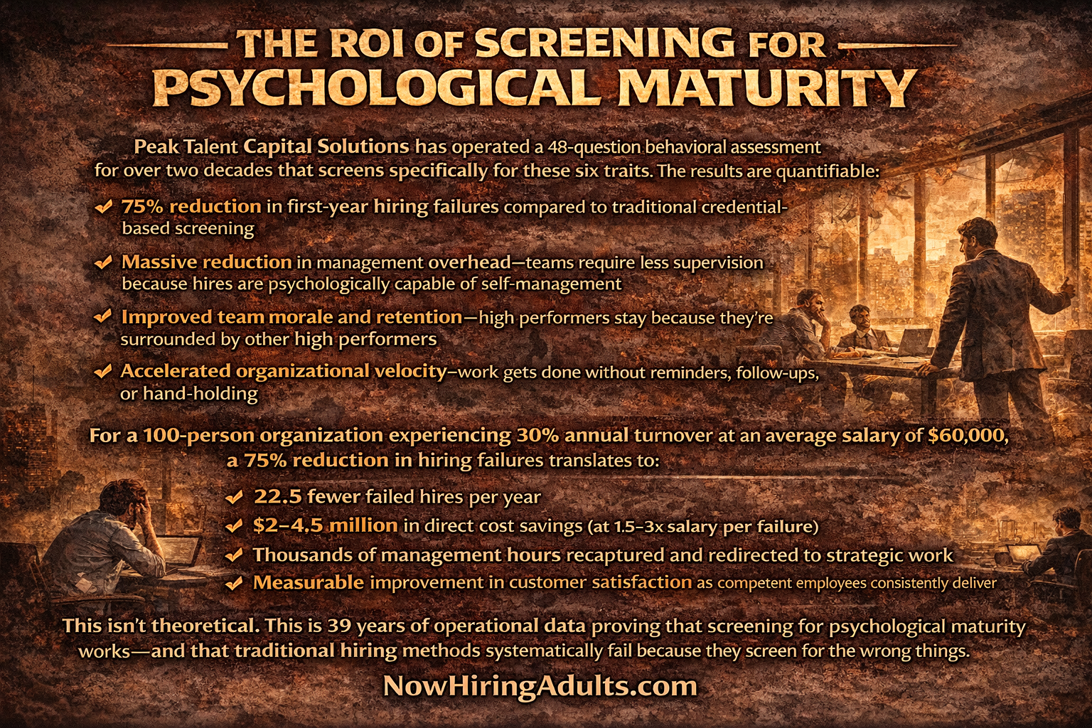 Organizations that screen for psychological maturity experience 75% fewer hiring failures, massive reductions in management overhead, improved team morale, higher retention of top performers, and accelerated organizational velocity.