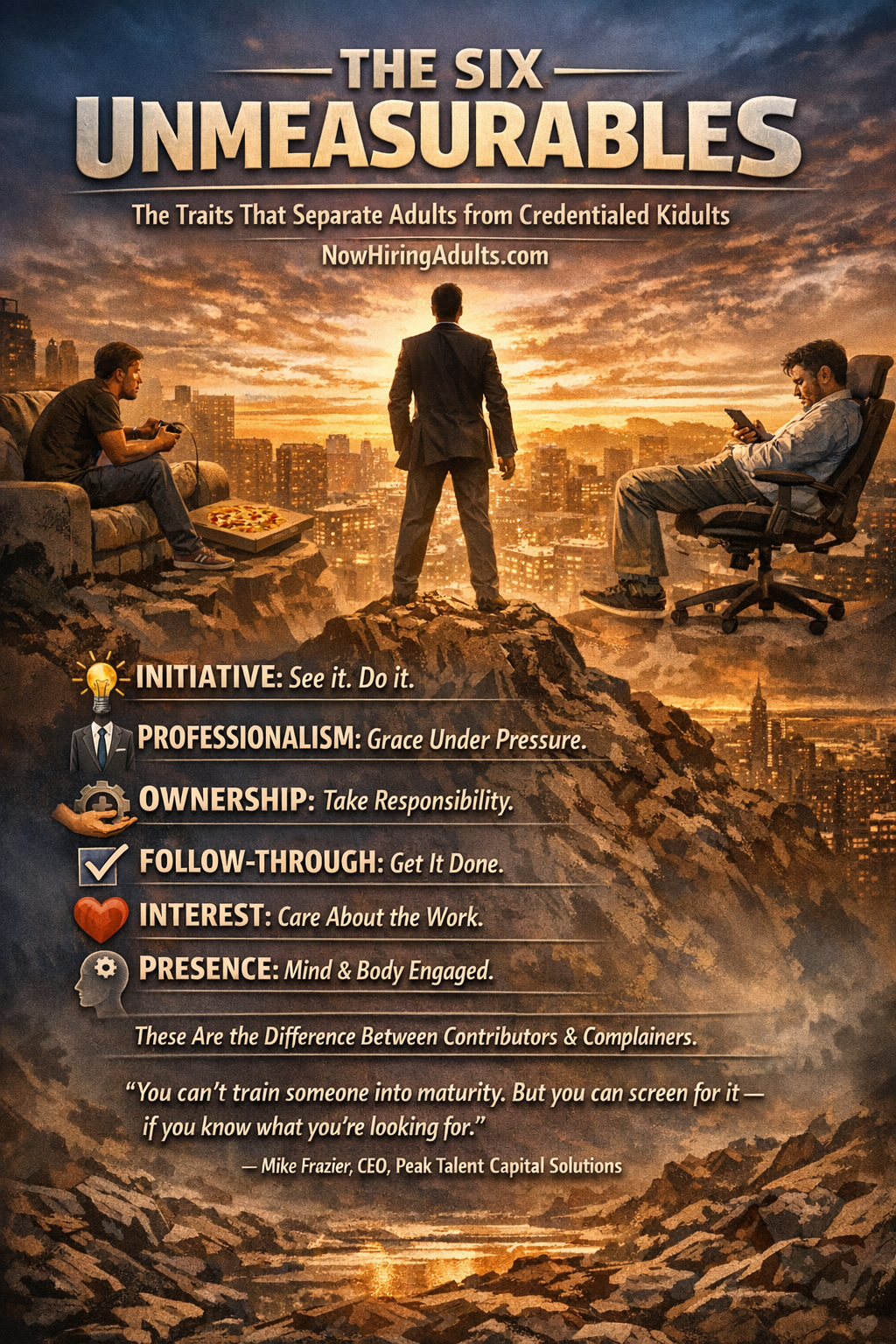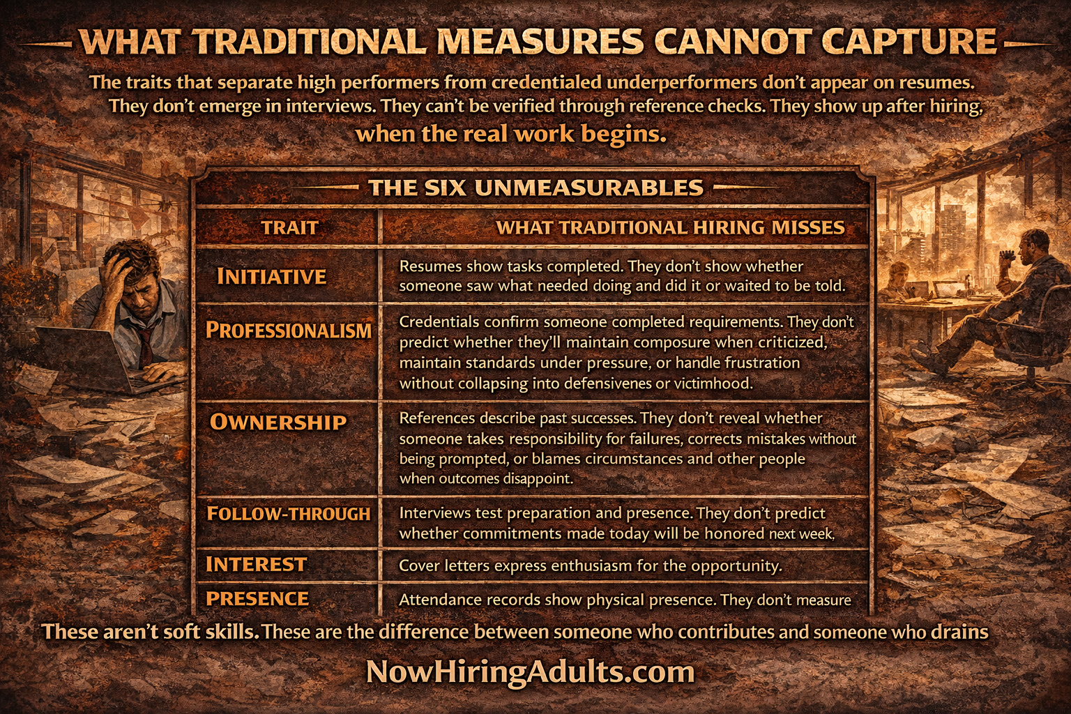The Six Unmeasurables—initiative, professionalism, ownership, follow-through, interest, and presence—are the traits that separate high performers from credentialed underperformers. They can't be trained. They can't be developed through onboarding. They must exist before hiring.